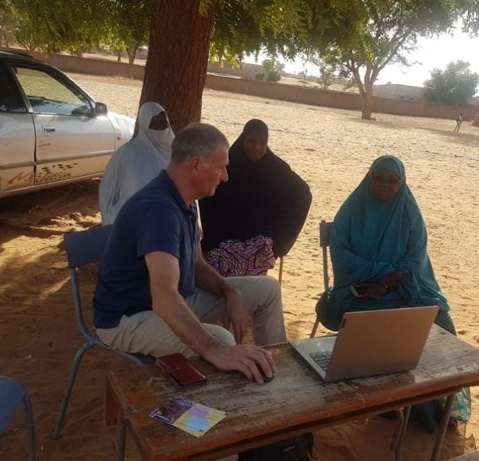 Eind november vertelde Baud er over PetitPouss, buiten onder een boom. Directeur Balkissa Alkouara (rechts op de foto) vroeg of hij wel wist dat er geen elektriciteit is, en dat de kinderen uit heel arme families komen waar geen geld is voor een tablet of smartphone. Baud: “Ik kon haar verzekeren dat wij alles op alles zouden zetten om deze school op de digitale kaart te zetten”.